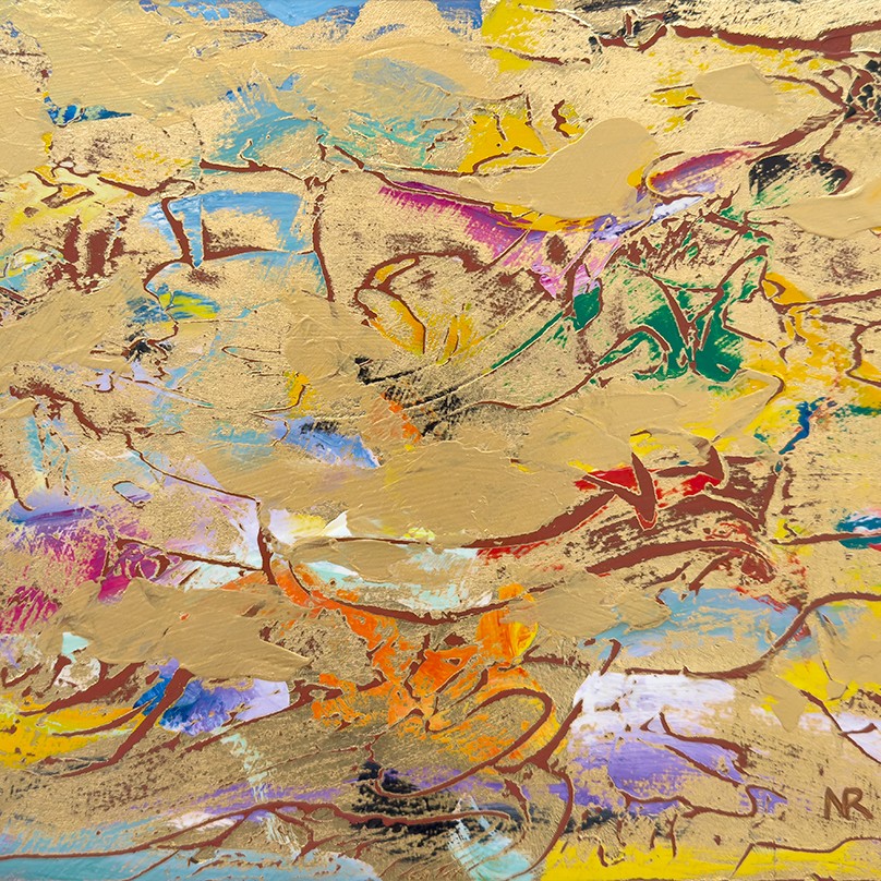 I use materials that excite me, like gold leaf and reflective pigments. Combined with paint, I manipulate the images until they seem to glow, and the materials appear to transform into something else, something otherworldly. Nature is my guiding principle to portray luminous notions of air, water, earth and light. Creating imaginary new worlds, merging the literal and the metaphorical, my paintings hover somewhere between pure abstraction and realistic landscape. The ability to dream and to create new worlds by taking a flat surface and transforming it, is the gift that painters can bring to the world. With this concept of manipulating dimensionality, a painter may point out something that already exists but in such a skillful manner that the viewer sees it in a brand new way. Thus painting can alter the viewer’s perception, launching them into an exploration of their own thoughts and beliefs. I believe true understanding, in general, comes with our ability and willingness to envision what is below the surface, offering an internal awareness. This is my mission as an artist— to bring elements of our consciousness that are hidden in plain sight into the light, into the observable...