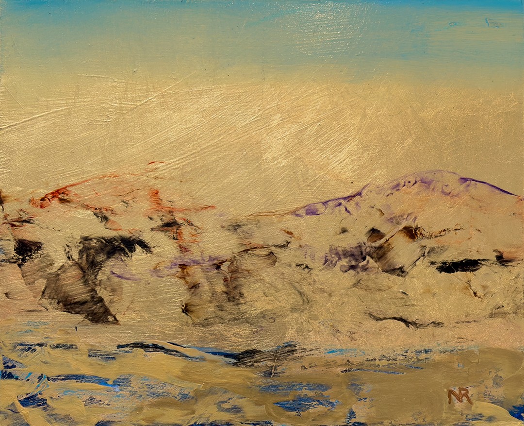 I use materials that excite me, like gold leaf and reflective pigments. Combined with paint, I manipulate the images until they seem to glow, and the materials appear to transform into something else, something otherworldly.