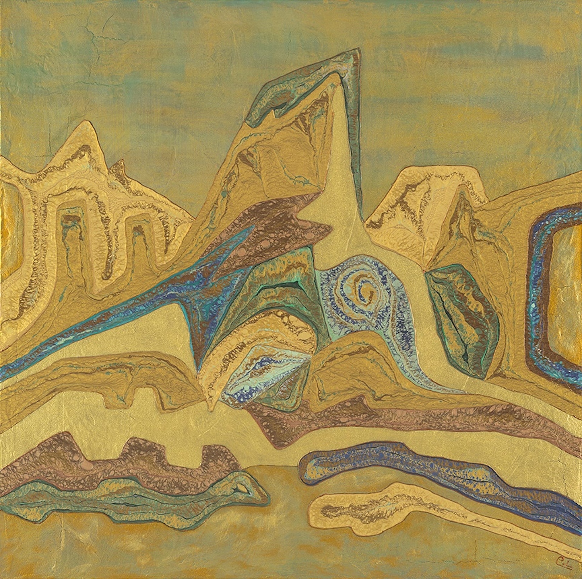 My process involves both intentionality and spontaneity, letting the mediums freely interact and speak for themselves. I use textural mediums such as crackling pastes and modeling gels to turn the canvas into an organic surface reminiscent of distressed wood or bark. I then apply layers of metallic acrylic to create history and patina. The abstract figures, based on archetypes of the Feminine, combine gold leaf wax applications and oil-based pouring techniques to emulate the appearance of stained glass. The abstract mixed media landscapes follow the same process with inspiring movements evoking gem-like shapes and mineral elements. Inspired by Art Nouveau and the decorative style of Austrian symbolic painter Gustav Klimt, my work uses universal symbols and themes of nature. Rather than overstate, I tend to stimulate the viewer’s imagination, hereby suggesting a mood of quiet mystery. Through intricate mixed media techniques, my art work reaches a compelling dimensionality, taking the viewer on a distinctive sensorial journey of exploration.