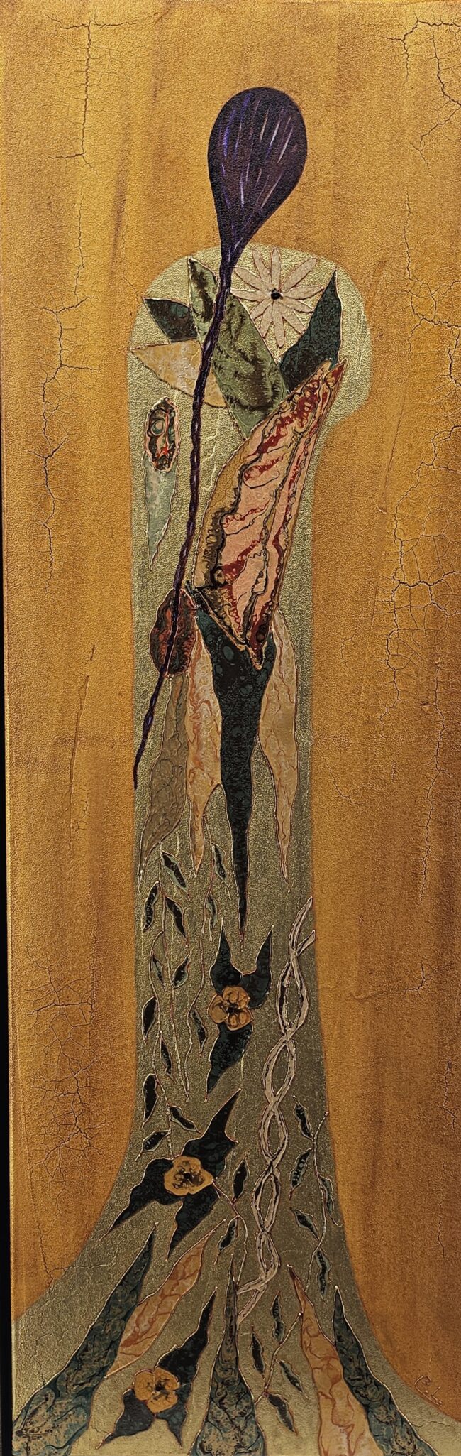 My process involves both intentionality and spontaneity, letting the mediums freely interact and speak for themselves. I use textural mediums such as crackling pastes and modeling gels to turn the canvas into an organic surface reminiscent of distressed wood or bark. I then apply layers of metallic acrylic to create history and patina. The abstract figures, based on archetypes of the Feminine, combine gold leaf wax applications and oil-based pouring techniques to emulate the appearance of stained glass. The abstract mixed media landscapes follow the same process with inspiring movements evoking gem-like shapes and mineral elements. Inspired by Art Nouveau and the decorative style of Austrian symbolic painter Gustav Klimt, my work uses universal symbols and themes of nature. Rather than overstate, I tend to stimulate the viewer’s imagination, hereby suggesting a mood of quiet mystery. Through intricate mixed media techniques, my art work reaches a compelling dimensionality, taking the viewer on a distinctive sensorial journey of exploration.