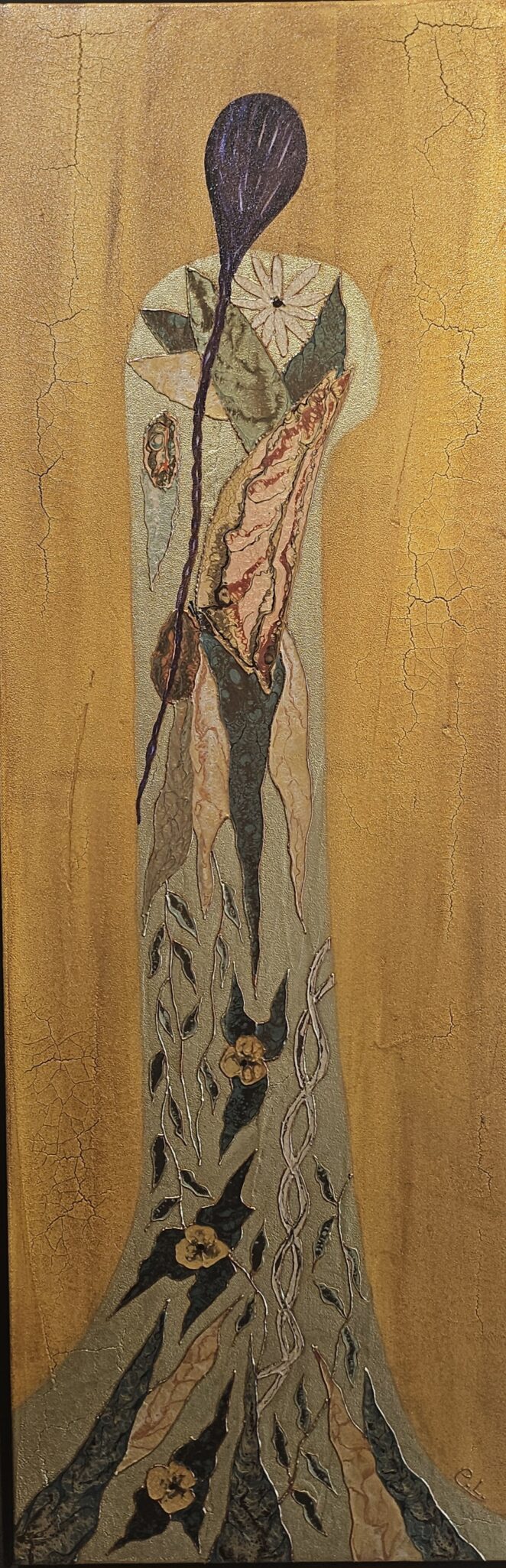 My process involves both intentionality and spontaneity, letting the mediums freely interact and speak for themselves. I use textural mediums such as crackling pastes and modeling gels to turn the canvas into an organic surface reminiscent of distressed wood or bark. I then apply layers of metallic acrylic to create history and patina. The abstract figures, based on archetypes of the Feminine, combine gold leaf wax applications and oil-based pouring techniques to emulate the appearance of stained glass. The abstract mixed media landscapes follow the same process with inspiring movements evoking gem-like shapes and mineral elements. Inspired by Art Nouveau and the decorative style of Austrian symbolic painter Gustav Klimt, my work uses universal symbols and themes of nature. Rather than overstate, I tend to stimulate the viewer’s imagination, hereby suggesting a mood of quiet mystery. Through intricate mixed media techniques, my art work reaches a compelling dimensionality, taking the viewer on a distinctive sensorial journey of exploration.