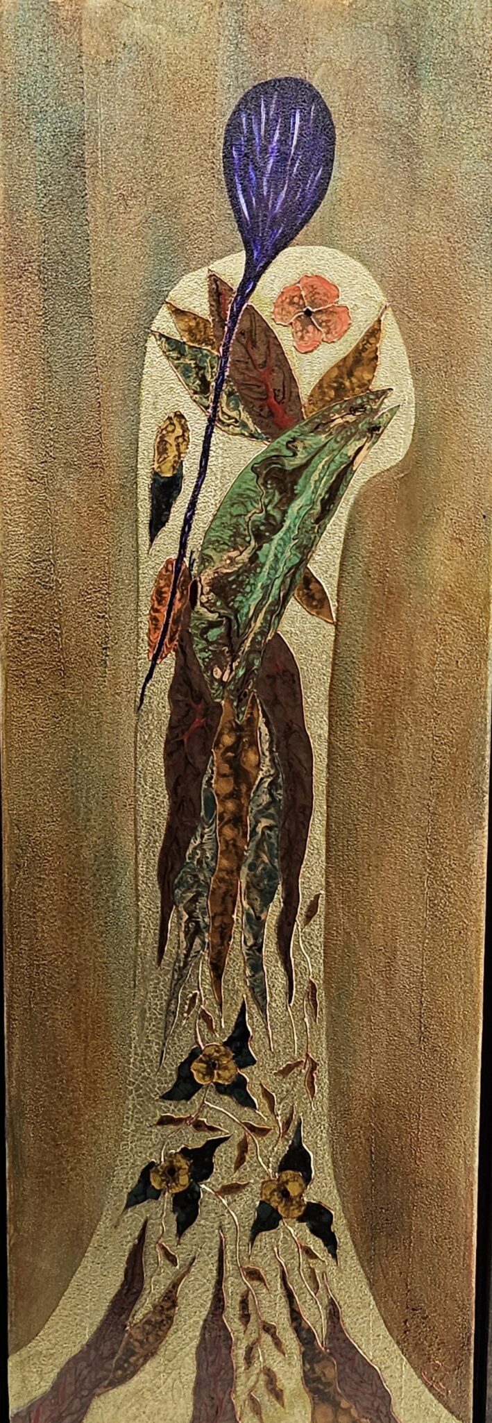 My process involves both intentionality and spontaneity, letting the mediums freely interact and speak for themselves. I use textural mediums such as crackling pastes and modeling gels to turn the canvas into an organic surface reminiscent of distressed wood or bark. I then apply layers of metallic acrylic to create history and patina. The abstract figures, based on archetypes of the Feminine, combine gold leaf wax applications and oil-based pouring techniques to emulate the appearance of stained glass. The abstract mixed media landscapes follow the same process with inspiring movements evoking gem-like shapes and mineral elements. Inspired by Art Nouveau and the decorative style of Austrian symbolic painter Gustav Klimt, my work uses universal symbols and themes of nature. Rather than overstate, I tend to stimulate the viewer’s imagination, hereby suggesting a mood of quiet mystery. Through intricate mixed media techniques, my art work reaches a compelling dimensionality, taking the viewer on a distinctive sensorial journey of exploration.