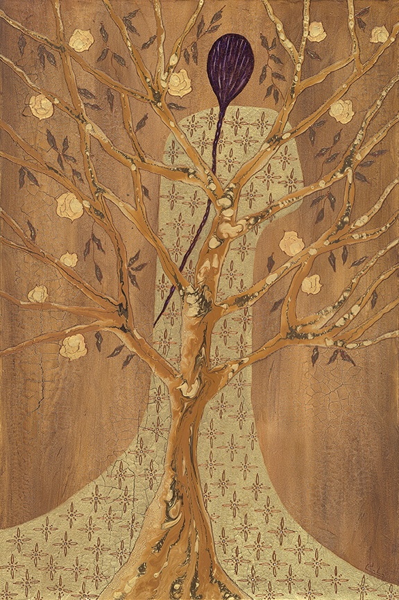 My process involves both intentionality and spontaneity, letting the mediums freely interact and speak for themselves. I use textural mediums such as crackling pastes and modeling gels to turn the canvas into an organic surface reminiscent of distressed wood or bark. I then apply layers of metallic acrylic to create history and patina. The abstract figures, based on archetypes of the Feminine, combine gold leaf wax applications and oil-based pouring techniques to emulate the appearance of stained glass. The abstract mixed media landscapes follow the same process with inspiring movements evoking gem-like shapes and mineral elements. Inspired by Art Nouveau and the decorative style of Austrian symbolic painter Gustav Klimt, my work uses universal symbols and themes of nature. Rather than overstate, I tend to stimulate the viewer’s imagination, hereby suggesting a mood of quiet mystery. Through intricate mixed media techniques, my art work reaches a compelling dimensionality, taking the viewer on a distinctive sensorial journey of exploration.